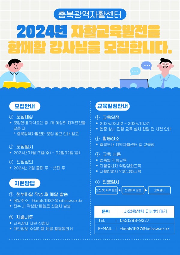 충북광역자활센터는 1월 17일부터 2월 2일까지 충북도내 자활현장에서 진행되는 교육을 이끌어갈 전문성을 갖춘 강사를 모집한다.