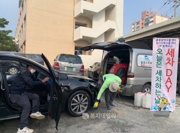 충북광역자활센터와 괴산지역자활센터는 10월 27일~28일 이틀간 충북괴산경찰서에서 지역 출장세차자활사업단의 홍보를 위한 마케팅의 일환으로 “세차DAY 오늘은 자활세차하는 날” 행사를 진행하였다. 이 행사는 코로나19바이러스가 잠잠해 지기를 기다렸다 백신의 접종률이 80%에 육박하고, 지역의 감염률이 떨어지는 요즘을 적기로 보고 실행되게 되었다.