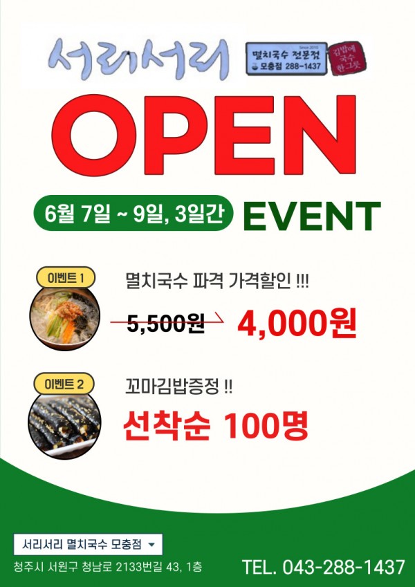 ㈜서리서리 모충점(김동춘 대표)은 7~9일 ‘자활기업 창업 오픈이벤트 멸치국수DAY’ 행사를 진행한다.